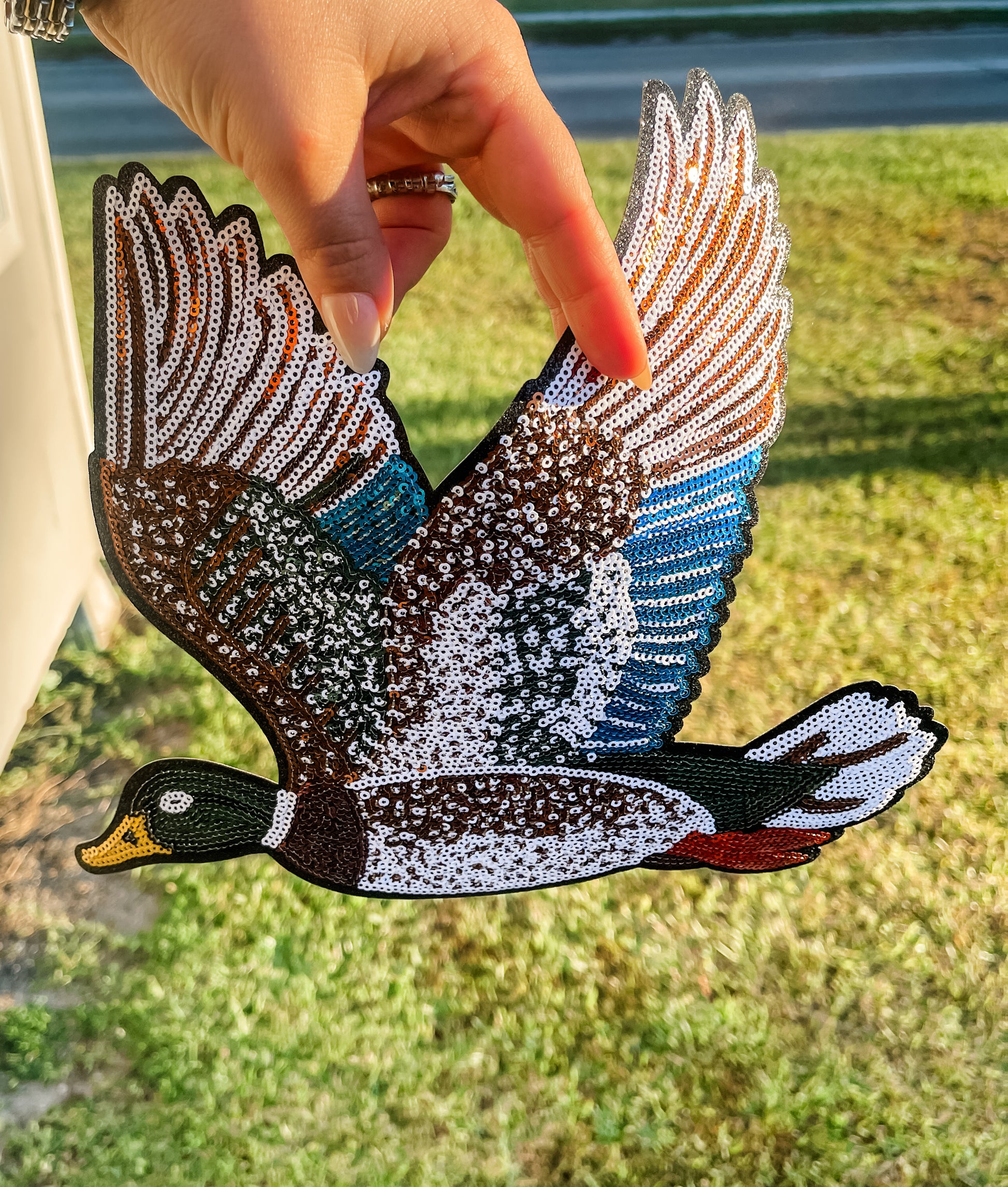 This crewneck features a gorgeous sequin mallard patch already applied — perfect for hunting season, camp weekends, or anyone who loves a little glam with their camo.