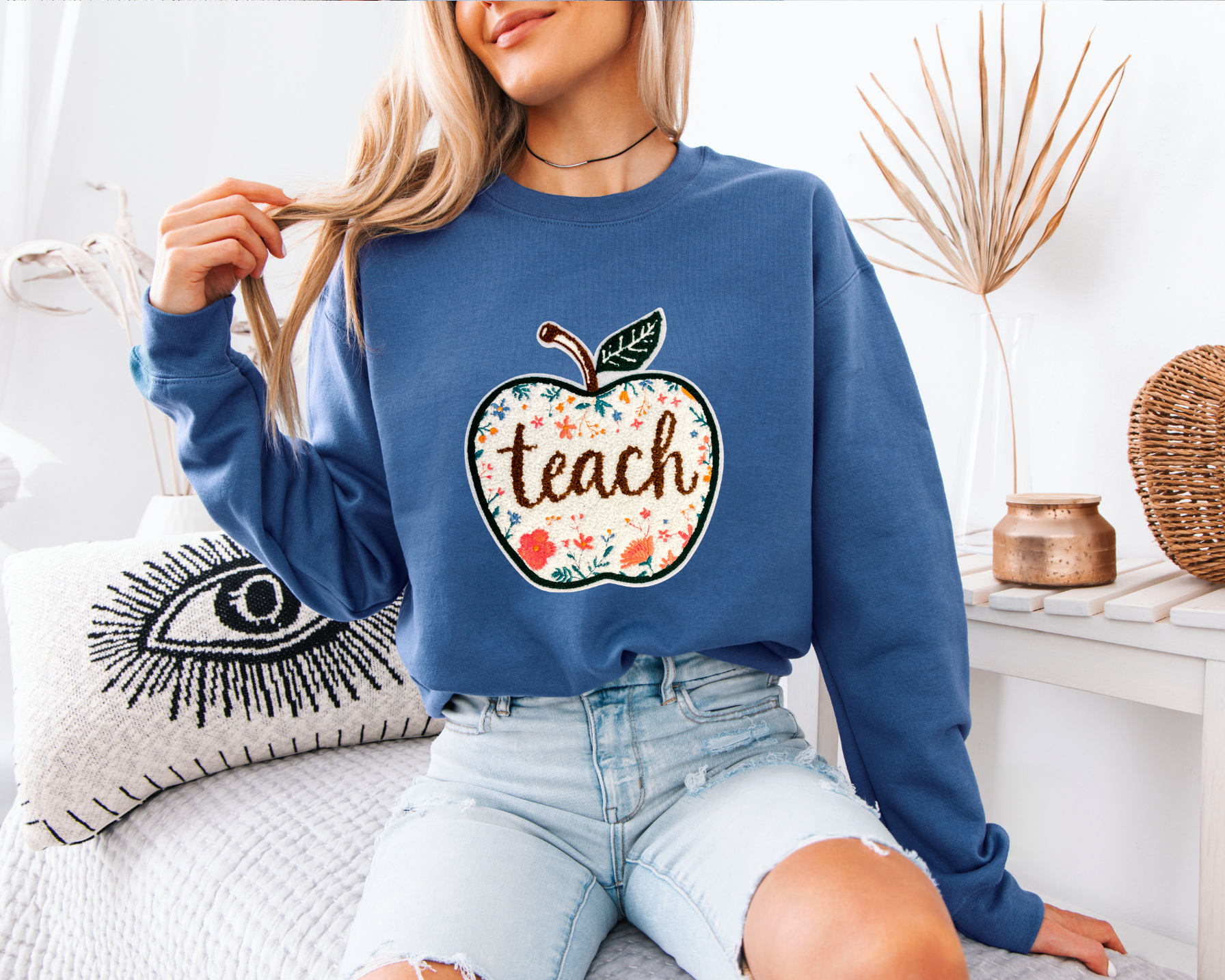 This textured chenille patch apple design pops beautifully on every color option and gives that high-end boutique look teachers LOVE. Choose your style — tee or sweatshirt — and rock the cutest teacher fit all year long.