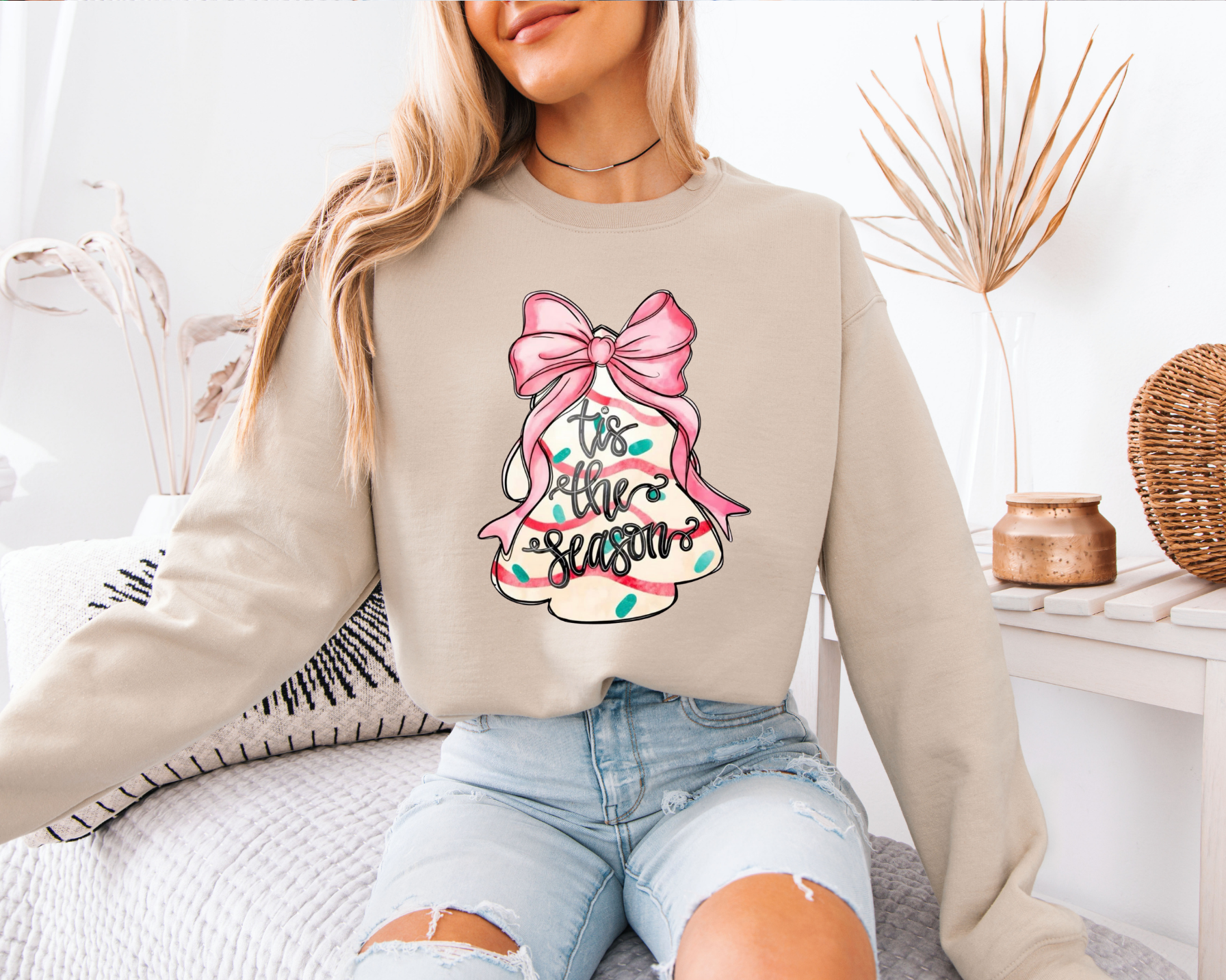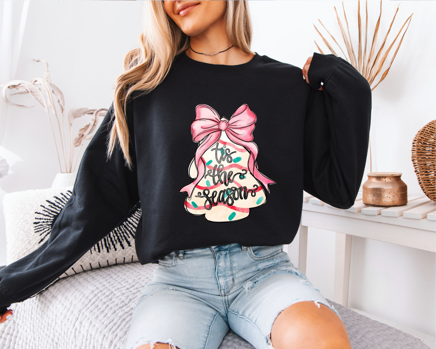 With soft pastels, a big pink bow, and a Christmas tree cake design, this transfer presses beautifully onto tees, sweatshirts, and more. The cutest holiday graphic for girlies who love a feminine Christmas aesthetic while also loving a Christmas tree cake!!