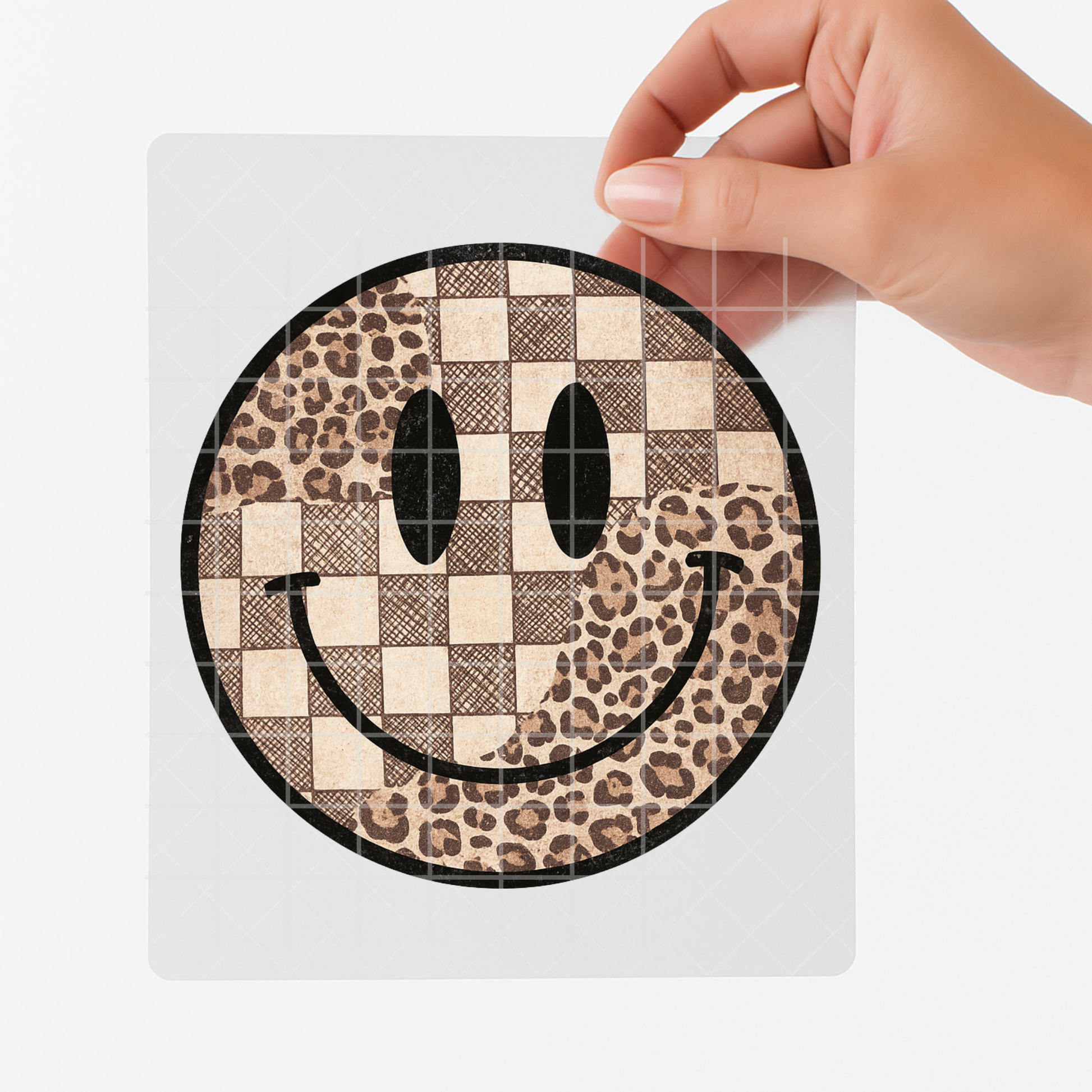This leopard and checkerboard smiley design brings playful, trendy vibes — perfect for any season and any mood!