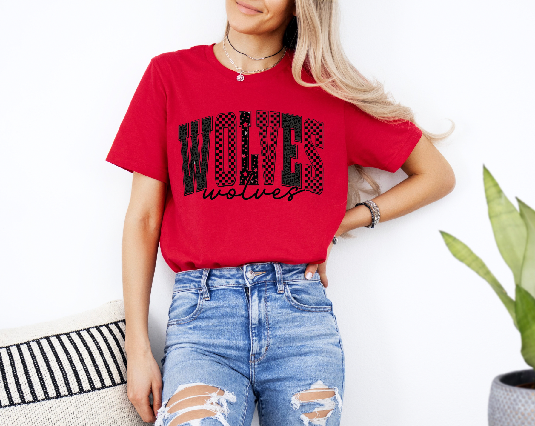 This black-and-white “Wolves” design mixes stars, leopard, and checkerboard patterns for the perfect cool-kid school spirit look!